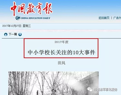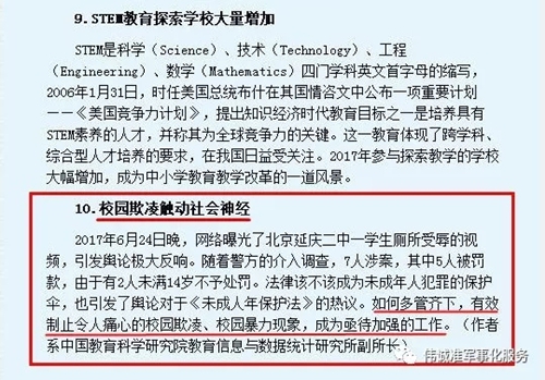 2017年12月27日,中國教育報刊登了一篇文章——《2017年度中小(xiǎo)學校(xiào)長關注的10大(dà)事件》,文章中指出的第10大(dà)事件就是校(xiào)園欺淩:“校(xiào)園欺淩觸動社會(huì)神經”!