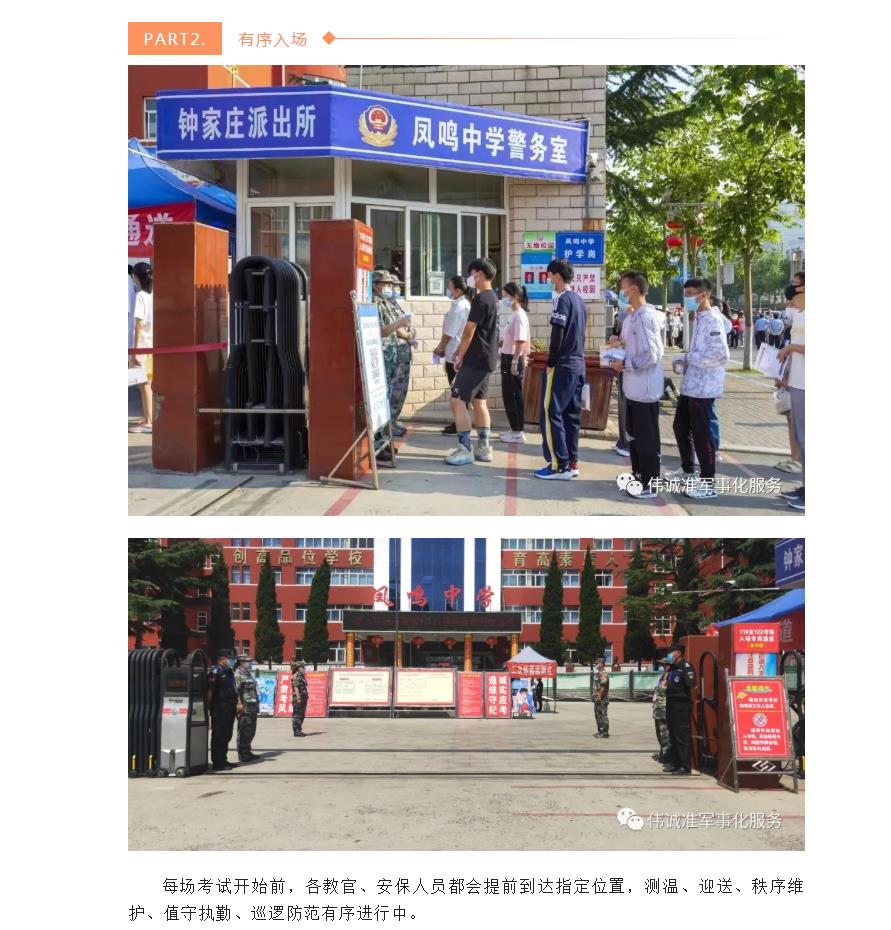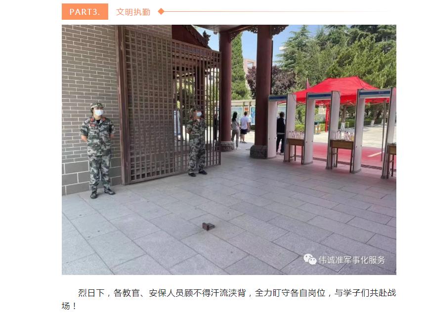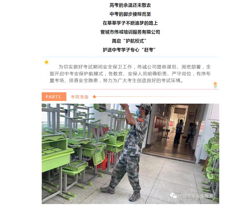 偉誠公司提前謀劃、周密部署,全面開(kāi)啓中考安保護航模式,各教官、安保人(rén)員明(míng)确職責、嚴守崗位,有(yǒu)序布置考場(chǎng)、排查安全隐患,努力為(wèi)廣大(dà)考生(shēng)創造良好的考試環境